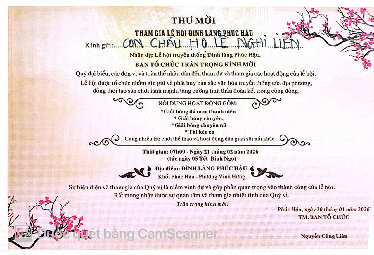 Nhân dịp đón Xuân Bính Ngọ, nhằm tạo không khí vui tươi, phấn khởi cho nhân dân vui Tết cổ truyền của dân tộc; Đồng thời tăng cường sự đoàn kết, gắn bó giữa các xóm trong toàn phường Vinh Hưng (xã Nghi Liên cũ), gìn giữ và phát huy các giá trị văn hóa truyền thống của lễ hội đình làng; Đoàn thanh niên Đội bóng đá Nam và Đội bóng chuyền Nữ của Họ Lê thực hiện tốt vận động "Toàn dân rèn luyện thân thể theo gương Bác Hồ vĩ đại" đã tích cực tham gia giao lưu giải thể thao Lễ Hội Đình Làng Phúc Hậu - Chào Xuân 2026, tạo không khí vui tươi, sôi nổi, tăng cường sự đoàn kết, giao lưu học hỏi, trao đổi kinh nghiệm giữa các đơn vị trên địa bàn của địa phương.